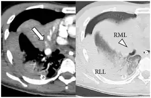 A pulmonary hematoma is a collection of blood within the tissue of the lung. It may result when a pulmonary laceration fills with blood.[1] A lung laceration filled with air is called a pneumatocele.[1] In some cases, both pneumatoceles and hematomas exist in the same injured lung.[2] Pulmonary hematomas take longer to heal than simple pneumatoceles and commonly leave the lungs scarred.[1] A pulmonary contusion is another cause of bleeding within the lung tissue, but these result from microhemorrhages, multiple small bleeds, and the bleeding is not a discrete mass but rather occurs within the lung tissue. An indication of more severe damage to the lung than pulmonary contusion, a hematoma also takes longer to clear.[3] Unlike contusions, hematomas do not usually interfere with gas exchange in the lung, but they do increase the risk of infection and abscess formation.[4]