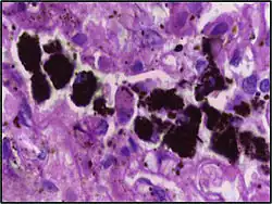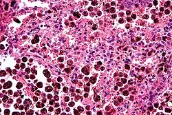 | Respiratory bronchiolitis | "Smoker’s macrophages" | Yellow to light brown and finely granular[4] | Airways (especially respiratory bronchioles) | Tobacco smoking | ![]() |