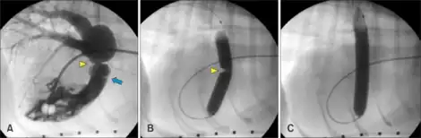 a)Pulmonary valve blue arrow and supravalvular pulmonic stenosis yellow arrowhead b)contrast solution across the stenotic lesion yellow arrowhead c) full inflation of balloon