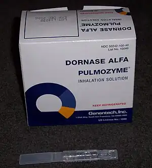 Dornase alfa, sold under the brand name Pulmozyme, is a medication used to treat cystic fibrosis.[1] It is used to decrease the thickness of mucus and thus make it easier to cough out.[1] It is used by breathing it in.[1]