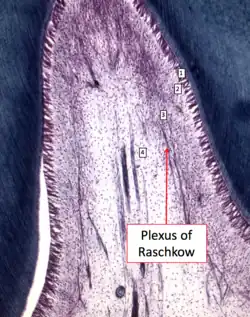 As the dental pulp is a highly vascularised and innervated region of the tooth, it is the site of origin for most pain-related sensations.[12] The dental pulp nerve is innervated by one of the trigeminal nerves, otherwise known as the fifth cranial nerve. The neurons enter the pulp cavity through the apical foramen and branch off to form the nerve plexus of Raschkow. Nerves from the plexus of Raschkow provide branches to form a marginal plexus around the odontoblasts, with some nerves penetrating the dentinal tubules.