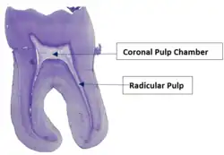 The pulp is the neurovascular bundle central to each tooth, permanent or primary. It is composed of a central pulp chamber, pulp horns, and radicular canals. The large mass of the pulp is contained within the pulp chamber, which is contained in and mimics the overall shape of the crown of the tooth.[2] Because of the continuous deposition of the dentine, the pulp chamber becomes smaller with the age. This is not uniform throughout the coronal pulp but progresses faster on the floor than on the roof or sidewalls.