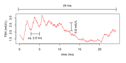 The secretion pattern of thyrotropin (TSH) is shaped by infradian, circadian and ultradian rhythms. Infradian rhythmis are mainly represented by circannual variation mirroring the seasonality of thyroid function.[10] Circadian rhythms lead to peak (acrophase) secretion around midnight and nadir concentrations around noon and in the early afternoon.[11][12] A similar pattern is observed for triiodothyronine, however with a phase shift.[12] Pulsatile release contributes to the ultradian rhythm of TSH concentration with about 10 pulses per 24 hours.[13][14][15] The amplitude of the circadian and ultradian rhythms is reduced in severe non-thyroidal illness syndrome (TACITUS).[16][17]