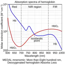 A typical pulse oximeter uses an electronic processor and a pair of small light-emitting diodes (LEDs) facing a photodiode through a translucent part of the patient's body, usually a fingertip or an earlobe. One LED is red, with wavelength of 660 nm, and the other is infrared with a wavelength of 940 nm. Absorption of light at these wavelengths differs significantly between blood loaded with oxygen and blood lacking oxygen. Oxygenated hemoglobin absorbs more infrared light and allows more red light to pass through. Deoxygenated hemoglobin allows more infrared light to pass through and absorbs more red light. The LEDs sequence through their cycle of one on, then the other, then both off about thirty times per second which allows the photodiode to respond to the red and infrared light separately and also adjust for the ambient light baseline.[39]