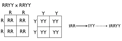 The forked-line method (also known as the tree method and the branching system) can also solve dihybrid and multi-hybrid crosses. A problem is converted to a series of monohybrid crosses, and the results are combined in a tree. However, a tree produces the same result as a Punnett square in less time and with more clarity. The example below assesses another double-heterozygote cross using RrYy x RrYy. As stated above, the phenotypic ratio is expected to be 9:3:3:1 if crossing unlinked genes from two double-heterozygotes. The genotypic ratio was obtained in the diagram below, this diagram will have more branches than if only analyzing for phenotypic ratio.