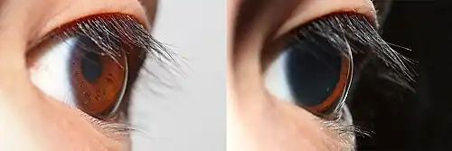 The pupillary reflex results in the pupil constricting (left) and dilating (right)