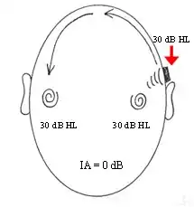 A reduction or loss of energy occurs with cross hearing, which is referred to as interaural attenuation (IA) or transcranial transmission loss.[13] IA varies with transducer type. It varies from 40 dB to 80 dB with supra-aural headphones. However, with insert earphones it is in the region of 55 dB. The use of insert earphones reduces the need for masking, due to the greater IA which occurs when they are used (See Figure 1).[14]