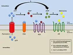 - ↑ Kukulski F, Lévesque SA, Sévigny J (2011). "Impact of ectoenzymes on p2 and p1 receptor signaling". Pharmacology of Purine and Pyrimidine Receptors. Advances in Pharmacology. Vol. 61. pp. 263–99. doi:10.1016/B978-0-12-385526-8.00009-6. ISBN 978-0-12-385526-8. PMID 21586362.