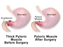 {{cite book}}:|work=ignored (help) - ↑ Oomen MW, Hoekstra LT, Bakx R, Ubbink DT, Heij HA (August 2012). "Open versus laparoscopic pyloromyotomy for hypertrophic pyloric stenosis: a systematic review and meta-analysis focusing on major complications". Surgical Endoscopy. 26 (8): 2104–2110. doi:10.1007/s00464-012-2174-y. PMC 3392506. PMID 22350232.