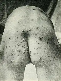 Pyoderma means any skin disease that is pyogenic (has pus). These include superficial bacterial infections such as impetigo, impetigo contagiosa, ecthyma, folliculitis, Bockhart's impetigo, furuncle, carbuncle, tropical ulcer, etc.[1][2] Autoimmune conditions include pyoderma gangrenosum. Pyoderma affects more than 111 million children worldwide, making it one of the three most common skin disorders in children along with scabies and tinea.[1]