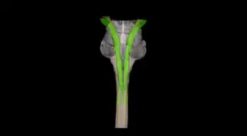 The nerve axons traveling down the tract are the efferent nerve fibers of the upper motor neurons. These axons travel down the tracts in the white matter of the spinal cord until they reach the vertebral level of the muscle that they will innervate.[5] At this point, the axons synapse with lower motor neurons. The majority of axons do not directly synapse with lower motor neurons, but instead synapse with an interneuron that then synapses with a lower motor neuron. This generally occurs in the anterior grey column.[2] Nerve axons of the lateral corticospinal tract that did not cross over in the medulla oblongata do so at the level of the spinal cord they terminate in.[6]