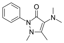Aminophenazone (or aminopyrine, amidopyrine, Pyramidon) is a non-narcotic analgesic substance. It is a pyrazolone and a derivative of phenazone, which also has anti-inflammatory and antipyretic properties. While inexpensive and effective, especially in the treatment of rheumatism, the drug carries a serious risk of severe and sometimes fatal side-effects, including agranulocytosis.[2] While its production and use have been banned in many countries, including France, Thailand, India, Japan and USA, it is still sometimes used in the developing world.[2]