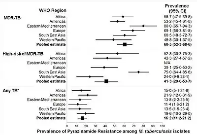 Global resistance of tuberculosis to pyrazinamide has been estimated to be in 16% of all cases, and 60% of people with multidrug-resistant tuberculosis.[21]