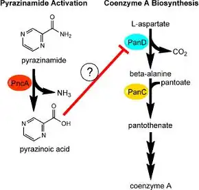 - ↑ Zimhony O, Cox JS, Welch JT, Vilchèze C, Jacobs WR (2000). "Pyrazinamide inhibits the eukaryotic-like fatty acid synthetase I (FASI) of Mycobacterium tuberculosis". Nature Medicine. 6 (9): 1043–47. doi:10.1038/79558. PMID 10973326.