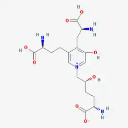 Pyridinoline, also known as Hydroxylysylpyridinoline, is a fluorescent cross-linking compound of collagen fibers. Crosslinks in collagen and elastin are derived from lysyl and hydroxylysyl residues,[1] a process catalyzed by lysyl oxidase. Fujimoto and colleagues first described the isolation and characterization of a fluorescent material in bovine Achilles tendon collagen and termed it pyridinoline.[2] It is reported to be present in collagen of bone and cartilage, but is absent in collagen of skin. It is not present in newly synthesized collagen and is formed from aldimine cross-links during maturation of collagen fibers.[3]