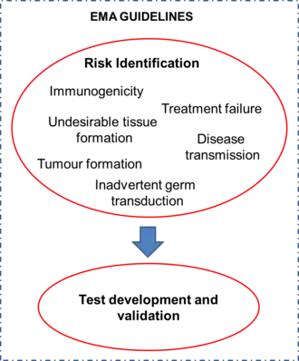 When quality control of TEMPs is considered, a risk assessment needs to be conducted. A risk is defined as a "potentially unfavourable effect that can be attributed to the clinical use of advanced therapy medicinal products (ATMPs) and is of concern to the patient and/or to other populations (e.g. caregivers and off-spring)".[3] Some risks include immunogenicity, disease transmission, tumor formation, treatment failure, undesirable tissue formation, and inadvertent germ transduction. A risk factor is defined as a "qualitative or quantitative characteristic that contributes to a specific risk following handling and/or administration of an ATMP".[3] The integration of all available information on risks and risk factors is called risk profiling. Due to the fact that every TEMP is different, the risks associated with each one of them vary and, subsequently, the procedures that must be implemented to ensure its quality are also unique to the product. Once the risks associated with the TEMP are identified, the appropriate tests must be developed and validated accordingly. Thus, there is no standard set of tests for the quality control of TEMPs. The EMA has released a set of regulatory guidelines on the topics to be considered by companies involved in the development and marketing of medicines for use in the European Union.[3][4][5][6] These guidelines have to be followed in order for the marketing authorization of a product to be issued. Fictitious examples of risk analysis for further elucidation of the process are provided in the EMA guidelines.[3]