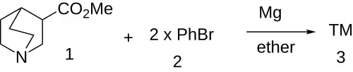 The Grignard reaction between methylquinuclidine-3-carboxylate [38206-86-9] (1) and phenylmagnesium bromide (2) gave the benzhydryl alcohol product ~29% yield. The ethyl ester is cas: [6238-33-1]