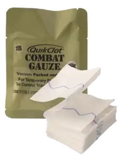 QuikClot is a brand of wound dressings that contain kaolin, a hemostatic agent. The brand is owned by Teleflex.[1] It is primarily used by militaries, surgeons, EMS, and first responding civilians to stop traumatic hemorrhage.