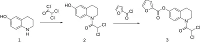 The synthesis begins by amidation of 6-hydroxytetrahydroquinoline with dichloroacetyl chloride. The sequence is completed by acylation with 2-furoyl chloride.