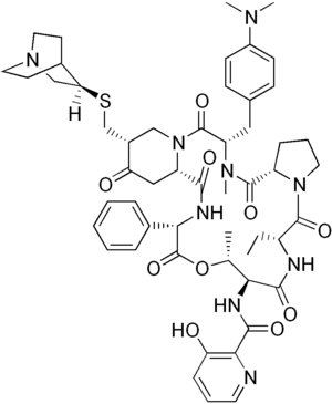 Quinupristin/dalfopristin, sold under the brand name Synercid, is a combination of two antibiotics used to treat infections by staphylococci, including Methicillin-resistant Staphylococcus aureus (MRSA) and vancomycin-resistant Enterococcus faecium (VRE).[1] It is not very effective against VRE.[2] It is given by gradual injection into a vein.[1]