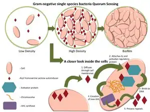 - ↑ Zhang LH, Dong YH (September 2004). "Quorum sensing and signal interference: diverse implications". Molecular Microbiology. 53 (6): 1563–1571. doi:10.1111/j.1365-2958.2004.04234.x. PMID 15341639. S2CID 39018931.