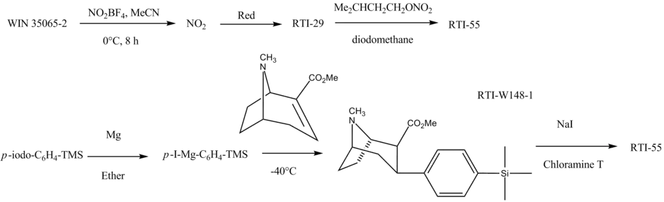 - ↑ Musachio JL, Keverline KI, Carroll FI, Dannals RF (January 1996). "3 Beta-(p-trimethylsilylphenyl)tropane-2 beta-carboxylic acid methyl ester: a new precursor for the preparation of [123I]RTI-55". Applied Radiation and Isotopes. 47 (1): 79–81. doi:10.1016/0969-8043(95)00259-6. PMID 8589674.