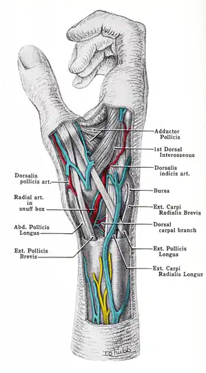 - Dorsal carpal branch of radial artery - a small vessel which arises beneath the extensor tendons of the thumb