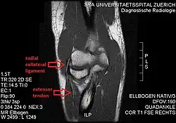 - ↑ Jacobson, Jon A.; Chiavaras, Mary M.; Lawton, Jason Michael; Downie, Brian; Yablon, Corrie M.; Lawton, Jeffrey (2014). "Radial Collateral Ligament of the Elbow". Journal of Ultrasound in Medicine. 33 (6): 1041–1048. doi:10.7863/ultra.33.6.1041. hdl:2027.42/135312. ISSN 1550-9613.