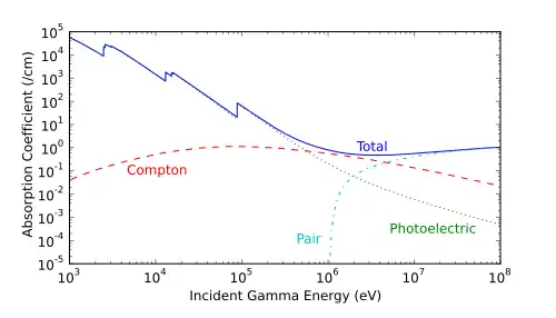 In a typical graded-Z shield, the high-Z layer effectively scatters protons and electrons. It also absorbs gamma rays, which produces X-ray fluorescence. Each subsequent layer absorbs the X-ray fluorescence of the previous material, eventually reducing the energy to a suitable level. Each decrease in energy produces Bremsstrahlung and Auger electrons, which are below the detector's energy threshold. Some designs also include an outer layer of aluminium, which may simply be the skin of the satellite. The effectiveness of a material as a biological shield is related to its cross-section for scattering and absorption, and to a first approximation is proportional to the total mass of material per unit area interposed along the line of sight between the radiation source and the region to be protected. Hence, shielding strength or "thickness" is conventionally measured in units of g/cm2. The radiation that manages to get through falls exponentially with the thickness of the shield. In x-ray facilities, walls surrounding the room with the x-ray generator may contain lead shielding such as lead sheets, or the plaster may contain barium sulfate. Operators view the target through a leaded glass screen, or if they must remain in the same room as the target, wear lead aprons.