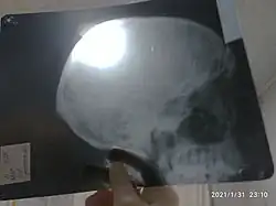 A medical radiograph of a skull
