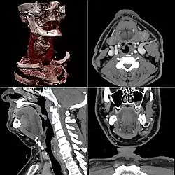 Images generated from computed tomography, including a 3D rendered image at upper left