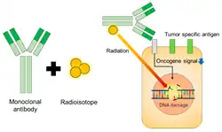 Radioimmunotherapy (RIT) uses an antibody labeled with a radionuclide to deliver cytotoxic radiation to a target cell.[1] It is a form of unsealed source radiotherapy. In cancer therapy, an antibody with specificity for a tumor-associated antigen is used to deliver a lethal dose of radiation to the tumor cells. The ability for the antibody to specifically bind to a tumor-associated antigen increases the dose delivered to the tumor cells while decreasing the dose to normal tissues. By its nature, RIT requires a tumor cell to express an antigen that is unique to the neoplasm or is not accessible in normal cells.