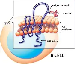 Bexxar, a radioligand therapy using the radioisotope I-131+Tositumomab (a murine monoclonal antibody) and binding/targeting the ligand CD20 on human B-cells.[43] CD20 is a membrane spanning protein found on B-cell lymphocytes that is a tumor marker as it is in higher concentration in cancer patients — specifically leukemias or lymphomas (like non-hodgkin's lymphoma).[44]