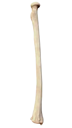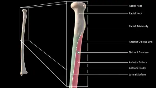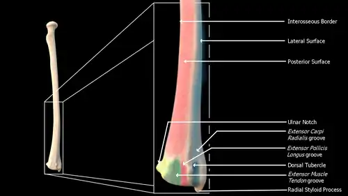 The radius has a body and two extremities. The upper extremity of the radius consists of a somewhat cylindrical head articulating with the ulna and the humerus, a neck, and a radial tuberosity.[1] The body of the radius is self-explanatory, and the lower extremity of the radius is roughly quadrilateral in shape, with articular surfaces for the ulna, scaphoid and lunate bones. The distal end of the radius forms two palpable points, radially the styloid process and Lister's tubercle on the ulnar side. Along with the proximal and distal radioulnar articulations, an interosseous membrane originates medially along the length of the body of the radius to attach the radius to the ulna.[2]