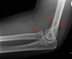 - Proximal radius fracture. A fracture within the capsule of the elbow joint results in the fat pad sign or "sail sign" which is a displacement of the fat pad at the elbow.