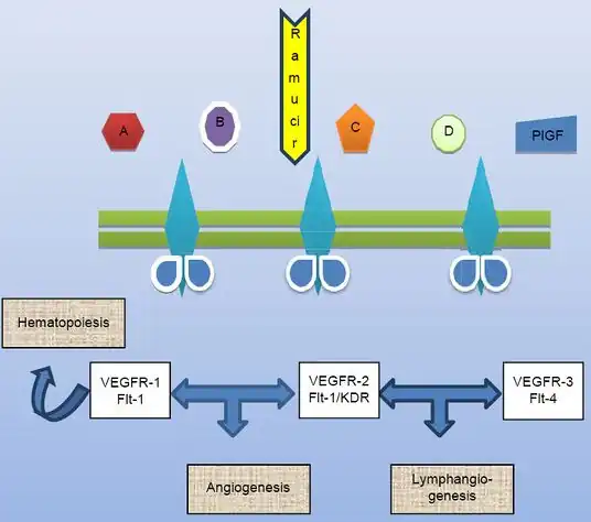Mechanism of ramucirumab. A to D refer to different ligands for vascular endothelial growth factor receptor (VEGFR). PIGF (placental growth factor). KDR (kinase insert domain receptor).[14]