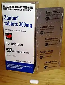 Archived 31 December 2019 at the Wayback Machine - ↑ "Class 2 Medicines recall: Zantac 75 Relief Tablets, Zantac 75 Tablets, Galpharm Indigestion Relief 75mg Tablets, Boots Heartburn & Indigestion Relief 75mg Tablets, Kirkland Indigestion Relief 75mg Tablets, Morrisons Indigestion & Heartburn Relief 75mg Tablets, Boots Heartburn & Indigestion Relief 75mg Tablets (EL (19)A/30)". GOV.uk. United Kingdom: Medicines and Healthcare products Regulatory Agency (MHRA). 25 October 2019. Archived from the original on 31 December 2019. Retrieved 30 March 2020.