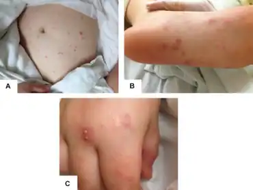| a)Erythematous papules on abdomen b) purpuric pustules on foot c)pustules on erythematous bases on hand. | |