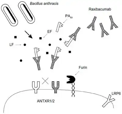 Raxibacumab injection is a monoclonal antibody targeting the protective antigen (PA) component of the lethal toxin of Bacillus anthracis.[6]