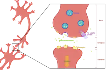 The main objective of a reuptake inhibitor is to substantially decrease the rate by which neurotransmitters are reabsorbed into the presynaptic neuron, increasing the concentration of neurotransmitter in the synapse. This increases neurotransmitter binding to pre- and postsynaptic neurotransmitter receptors.[9] Depending on the neuronal system in question, a reuptake inhibitor can have drastic effects on cognition and behavior. Non-competitive inhibition of the bacterial homologue LeuT by tricyclic antidepressants resulted from binding of these inhibitors in the extracellular permeation pathway.[10][11] However, the competitive nature of serotonin transport inhibition by antidepressants suggests that in neurotransmitter transporters, they bind in a site overlapping the substrate site.[12]