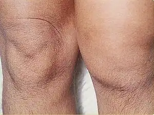Reactive arthritis, formerly known as Reiter's syndrome, is a form of arthritis that develops in response to a bacterial infection in another part of the body.[5][4] Symptoms include joint swelling, pain, and stiffness, most often of the knee or ankle.[2][5] Other symptoms may include mouth ulcers, inflammation of the whites of the eyes, and pain with urination.[2] Onset is generally one to four weeks after the triggering infection.[2] Complications may include uveitis or ankylosing spondylitis.[2][3]