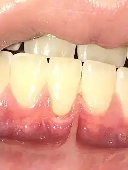 Gingival recession, also known as gum recession and receding gums, is the exposure in the roots of the teeth caused by a loss of gum tissue or retraction of the gingival margin from the crown of the teeth.[1] Gum recession is a common problem in adults over the age of 40, but it may also occur starting in adolescence, or around the age of 10. It may exist with or without concomitant decrease in crown-to-root ratio (recession of alveolar bone). 85% of the world population has gingival recession on at least one tooth with denuded root surface ≥1.0 mm.[2]