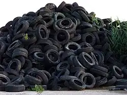 Because tires are highly durable and non-biodegradable, they can consume valuable space in landfills.[42] If waste tires are improperly managed they may cause rubber pollution. In 1990, it was estimated that over 1 billion scrap tires were in stockpiles in the United States. As of 2015, only 67 million tires remain in stockpiles.[43] From 1994 to 2010, the European Union increased the amount of tires recycled from 25% of annual discards to nearly 95%, with roughly half of the end-of-life tires used for energy, mostly in cement manufacturing.[44][45]