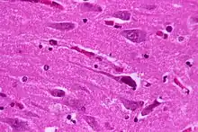 A "red neuron" (acidophilic or "eosinophilic" neuron) is a pathological finding in neurons, generally of the central nervous system, indicative of acute neuronal injury and subsequent apoptosis or necrosis. Acidophilic neurons are often found in the first 12–24 hours after an ischemic injury such as a stroke. Since neurons are permanent cells, they are most susceptible to hypoxic injury. The red coloration is due to pyknosis or degradation of the nucleus and loss of Nissl bodies which are normally stained blue (basophilic) on hematoxylin & eosin staining (H&E stain). This leaves only the degraded proteins which stains red (eosinophilic). Acidophilic neurons also can be stained with acidic dyes other than eosin (e.g. acid fuchsin and light green yellowish).[1]