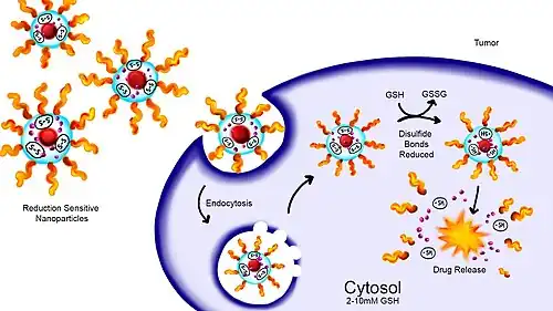 - 1 2 3 4 5 6 7 Sun, Huanli; Zhang, Yifan; Zhong, Zhiyuan (July 2018). "Reduction-sensitive polymeric nanomedicines: An emerging multifunctional platform for targeted cancer therapy". Advanced Drug Delivery Reviews. 132: 16–32. doi:10.1016/j.addr.2018.05.007. ISSN 0169-409X. PMID 29775625. S2CID 21742380.