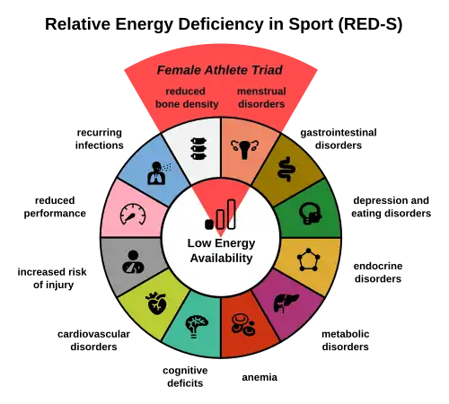 Relative energy deficiency in sport (RED-S)[1][2] is a syndrome in which disordered eating (or low energy availability),[3] amenorrhoea/oligomenorrhoea (in women), and decreased bone mineral density (osteoporosis and osteopenia) are present.[4] It is caused by eating too little food to support the amount of energy being expended by an athlete, often at the urging of a coach or other authority figure who believes that athletes are more likely to win competitions when they have an extremely lean body type. RED-S is a serious illness with lifelong health consequences and can potentially be fatal.[5]