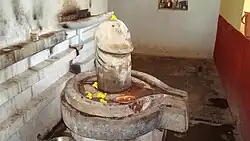 Sculptural representation of lingam, male sex organ-placed on yoni, female sex organ. In Hinduism, lingam and yoni represent the masculine and the feminine creative principles respectively.[84]