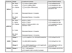 In 2004, the Acute Dialysis Quality Initiative group standardized the definition of AKI using the "RIFLE" criteria.[14] Based on GFR, serum creatinine values, and urine output plotted against time of admission, RIFLE, a mnemonic for three levels of severity – Risk, Injury, and Failure, and two outcomes, Loss and End-stage kidney disease, marks progressive degrees of injury in both ICU and non-ICU adult patients. In 2007, the Acute Kidney Injury Network (AKIN) devised strata which defined AKI based on time in relation to absolute creatinine increase, percentage increase, or documented oliguria, broadening the window for time of AKI diagnosis and creating an automatic "failure" designation for any patient placed on renal replacement therapy.[15] In 2007, a pediatric RIFLE (pRIFLE) stratification system was established with weight based – pediatric specific cut-offs for estimated GFR and urine output.[16] Most recently, the Kidney Diseases Improving Global Outcomes (KDIGO) collaborative issued newer severity based AKI stages (Table 2 - Staging Criteria for AKI).[17] Since 2005, numerous studies in both adult and pediatric patient populations have demonstrated that, retrospectively, escalating severity of AKI stratified by these criteria are associated with increased in-hospital morbidity, hospital length of stay, persistence of kidney disease to chronic kidney disease, and mortality.