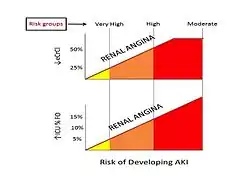 In nephrology, renal angina is a clinical methodology to risk stratify patients for the development of persistent and severe acute kidney injury (AKI).[1] The composite of risk factors and early signs of injury for AKI, renal angina is used as a clinical adjunct to help optimize the use of novel AKI biomarker testing. The term angina (from Latin 'infection of the throat' and Greek ankhone 'strangling') are utilized in the context of AKI to denote the development of injury and the choking off of kidney function. Unlike angina pectoris, commonly caused due to ischemia of the heart muscle secondary to coronary artery occlusion or vasospasm, renal angina carries no obvious physical symptomatology (i.e., flank tenderness, suprapubic tenderness, pain with voiding or micturition). Renal angina was derived as a conceptual framework to identify evolving AKI. Like acute coronary syndrome which precedes or is a sign of a heart attack, renal angina is used as a herald sign for a kidney attack.[2] Detection of renal angina is performed by calculating the renal angina index.[3]