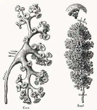 An image showing just the pelvis and calices of the kidneys, with the rest of the kidney removed, from a dissected cow and seal specimen. These vary greatly in size and number depending on species.